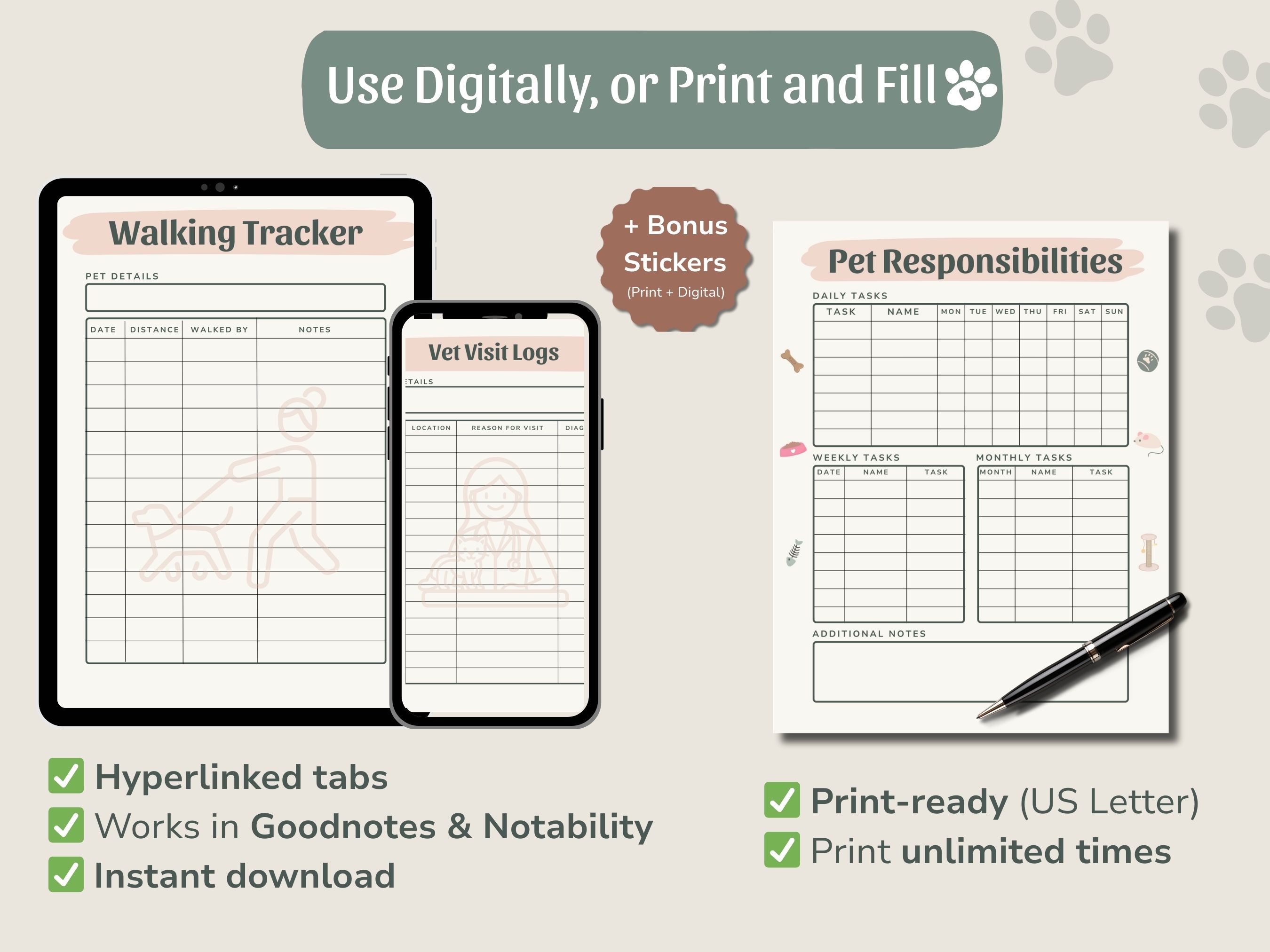 You can open the PDF on your tablet with GoodNotes (recommended) or any PDF app, or simply print it out as a pet care binder. Either way, you’ll have a flexible planner you can use in the way that works best for you.