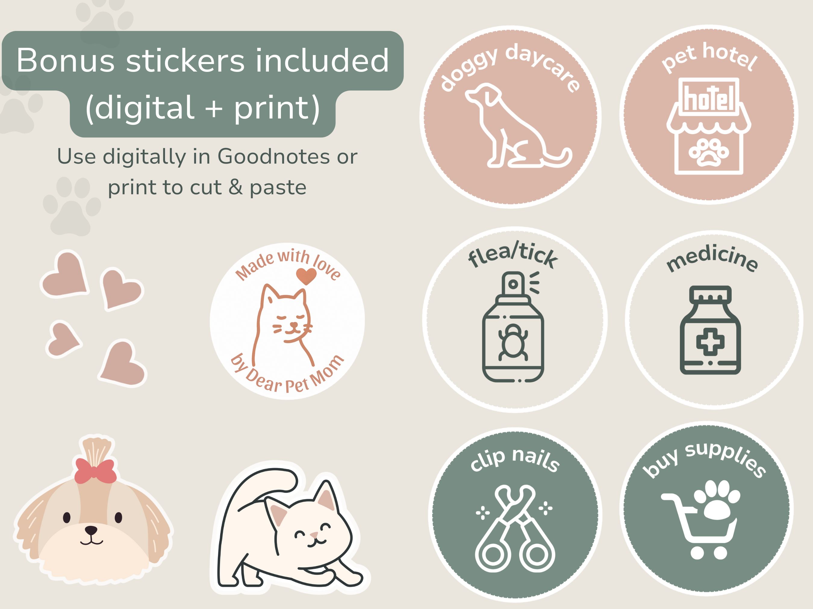 Bring your Pet Mom Planner to life with a set of matching digital and print stickers. Use them in GoodNotes to mark vet visits, grooming, daycare, and more, or print them out for your paper planner. These stickers make planning both practical and fun, helping you stay organized while adding a touch of personality and joy to every page.